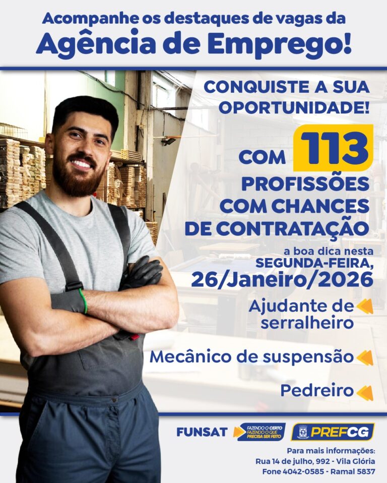 A Agência de Empregos da Fundação Social do Trabalho (Funsat) oferece, nesta segunda-feira (26), um total de 1.213 vagas. As oportunidades são anunciadas por 128 empresas de Campo Grande, que buscam profissionais para 113 funções diferentes.
