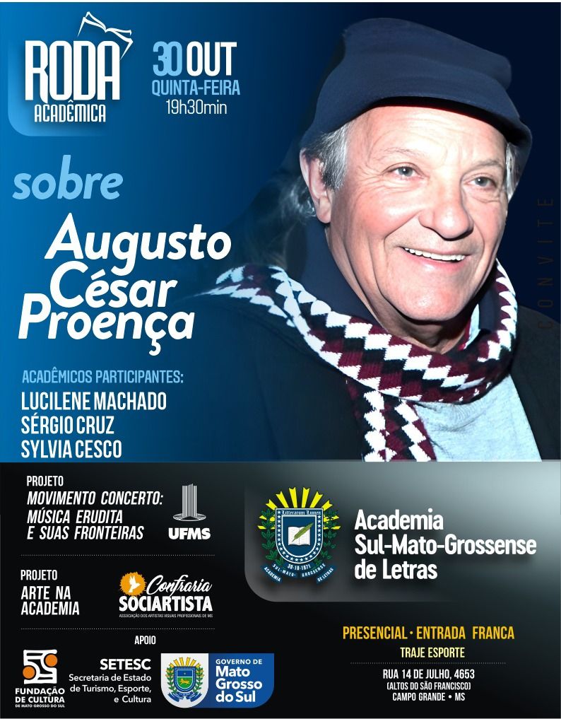 A Academia Sul-Mato-Grossense de Letras realiza nesta quinta-feira, 30 de outubro, às 19h30, mais uma edição da Roda Acadêmica, com homenagem ao saudoso escritor Augusto César Proença. O evento será realizado presencialmente no auditório da ASL, localizado na Rua 14 de Julho, nº 4653, Altos do São Francisco, com entrada gratuita. O projeto é uma parceria da ASL com apoio da Setesc – Secretaria de Estado de Turismo, Esporte e Cultura – pela Fundação de Cultura de MS – FCMS.