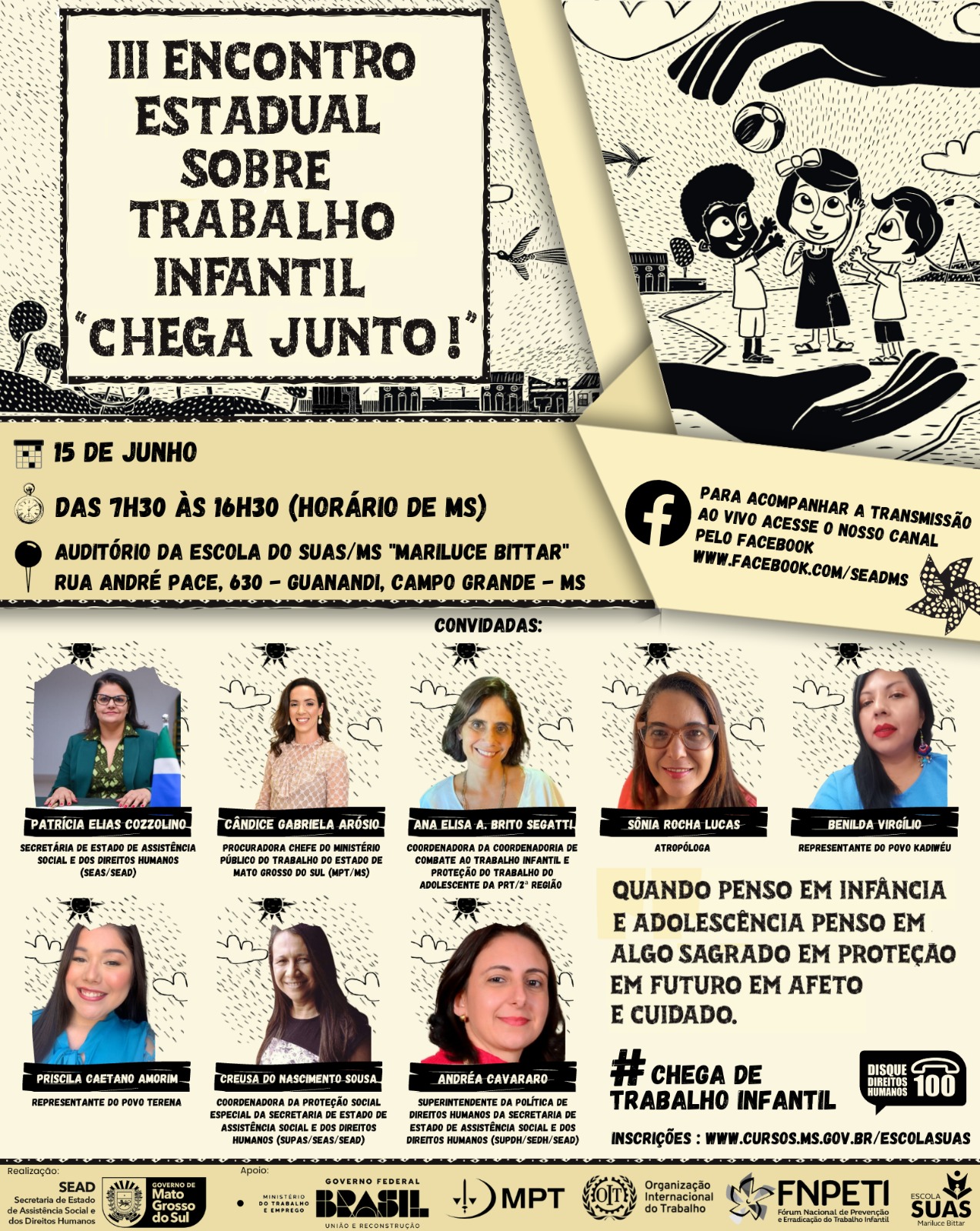 O “III Encontro Estadual sobre o Trabalho Infantil” será realizado nesta quinta-feira (15), a partir das 8h, no auditório da Escola do SUAS/MS “Mariluce Bittar”, na Capital. O evento, ainda em alusão ao Dia Mundial Contra o Trabalho Infantil, celebrado em 12 de junho, contará com transmissão ao vivo pela página da Sead (Secretaria de Estado de Assistência Social e dos Direitos Humanos) no Facebook.