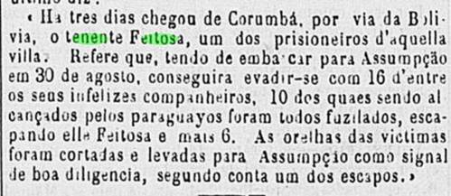 Há três dias chegou de Corumbá, por via da Bolívia, o tenente Feitosa, um dos prisioneiros daquela vila. Refere que, tendo que embarcar para Assunção em 30 de agosto, conseguira evadir-se com 16 dentre os seus infelizes companheiros, 10 dos quais sendo alcançados pelos paraguaios foram todos fuzilados, escapando ele – Feitosa – e mais 6. As orelhas das vítimas foram cortadas e levadas para Assunção como sinal de boa diligência, segundo conta um dos escapos”.