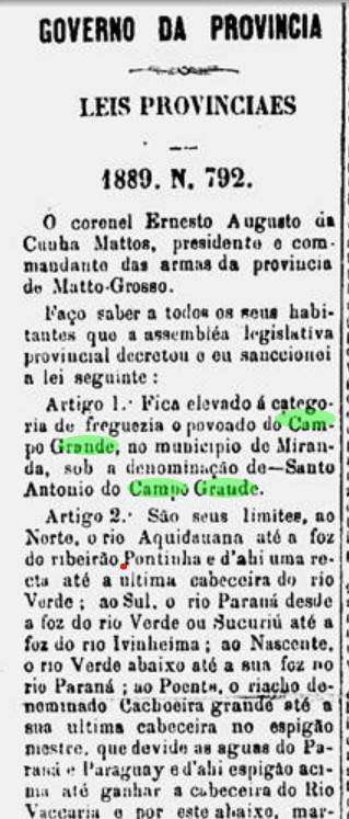 Lei provincial no 792, de 24 de dezembro de 1889, do governador Cunha Matos, cria o distrito de paz Campo Grande: