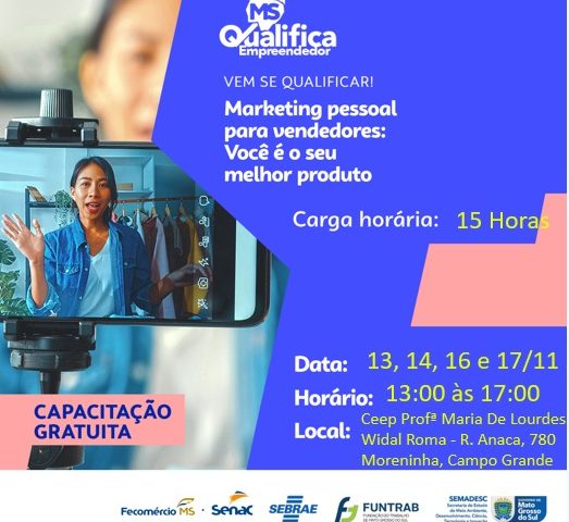 Dando prosseguimento às diretrizes do ‘MS Qualifica’, as aulas dos cursos de qualificação do Senac se iniciam a partir do dia 11/11(sábado). Os cursos são 100% gratuitos e presenciais e em parceria com a Secretaria de Estado de Educação de MS(SED-MS), todos serão realizados no Centro Estadual de Educação Profissional Prof. Maria de Lourdes Widal Roma – na Rua Anacá, 780 – Moreninha III: