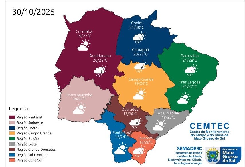 Em relação às temperaturas, são esperadas mínimas entre 15-17°C e máximas entre 24-26°C para as regiões sul, cone-sul e grande Dourados. Nas regiões pantaneira e sudoeste, as mínimas variam entre 18-20°C e as máxima entre 26-28°C. Já as regiões do bolsão, leste e norte devem registrar mínimas entre 18-21°C e máximas entre 25-30°C. Em Campo Grande estão previstas mínima de 19°C e máxima de até 26°C.