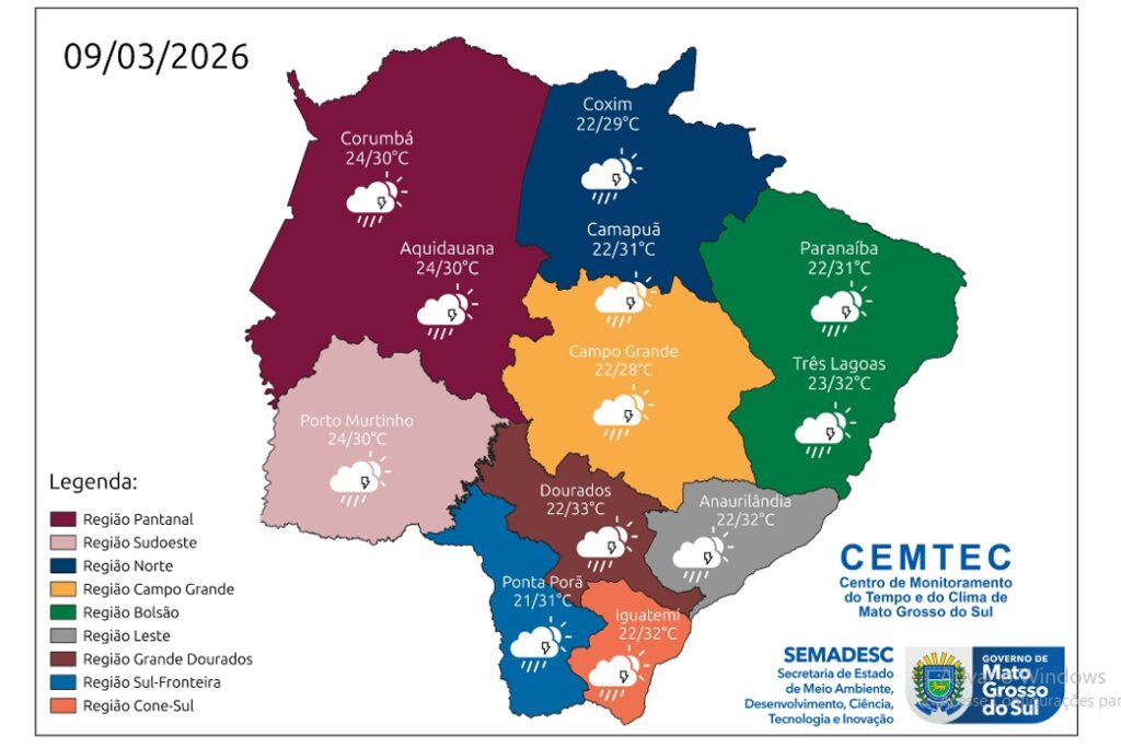 A temperaturas devem apresentar máximas entre 31-33°C e mínimas em 21-22°C nas regiões sul-fronteira, cone-sul e Grande Dourados. Nas regiões do pantanal e sudoeste, as máximas devem ficarem 30°C e as mínimas em 24°C. As regiões do bolsão, leste e norte devem registrar máximas entre 29-32°C e mínimas em 22-23°C. Em Campo Grande, estão previstas máxima de 28°C e mínima de 22.