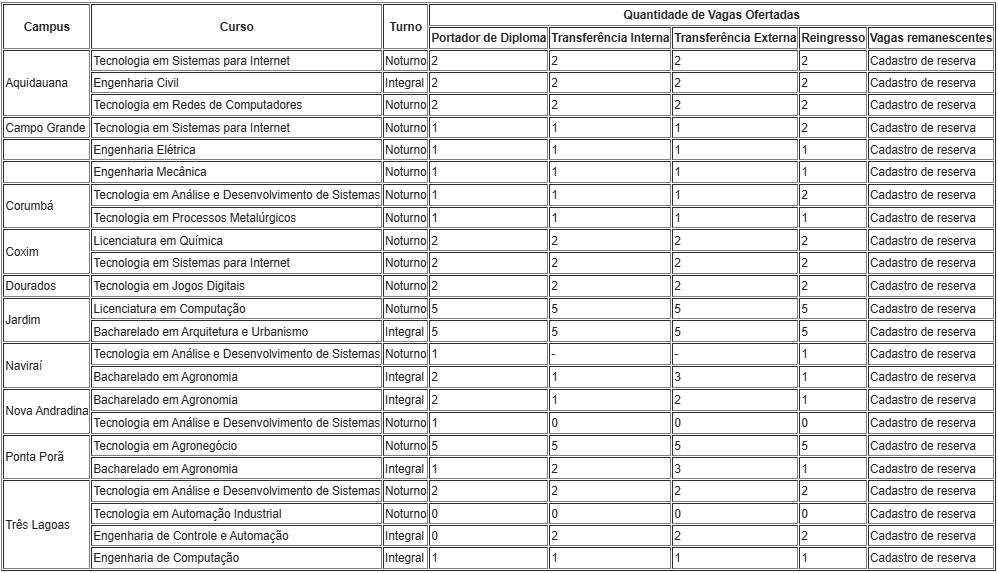 - Transferência Externa: para estudante de outra instituição (pública ou privada) que queira se transferir para o IFMS.