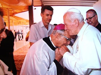 Em sua primeira visita ao Brasil, João Paulo II inclui a capital de Mato Grosso do Sul em seu roteiro. O papa desembarcou as 19,28 h, de 16 de outubro de 1991, na Base Aérea, seguindo de papamóvel até a missão salesiana. Mais de 100 pessoas aplaudiram o chefe da igreja católica em sua chegada. Foi recebido pelo governador Pedro Pedrosssian e pelo prefeito Lúdio Coelho. Permaneceu poucos minutos na pista do aeroporto, tempo suficiente para dar bênção à imagem de Nossa Senhora de Loreto, padroeira da aviação.