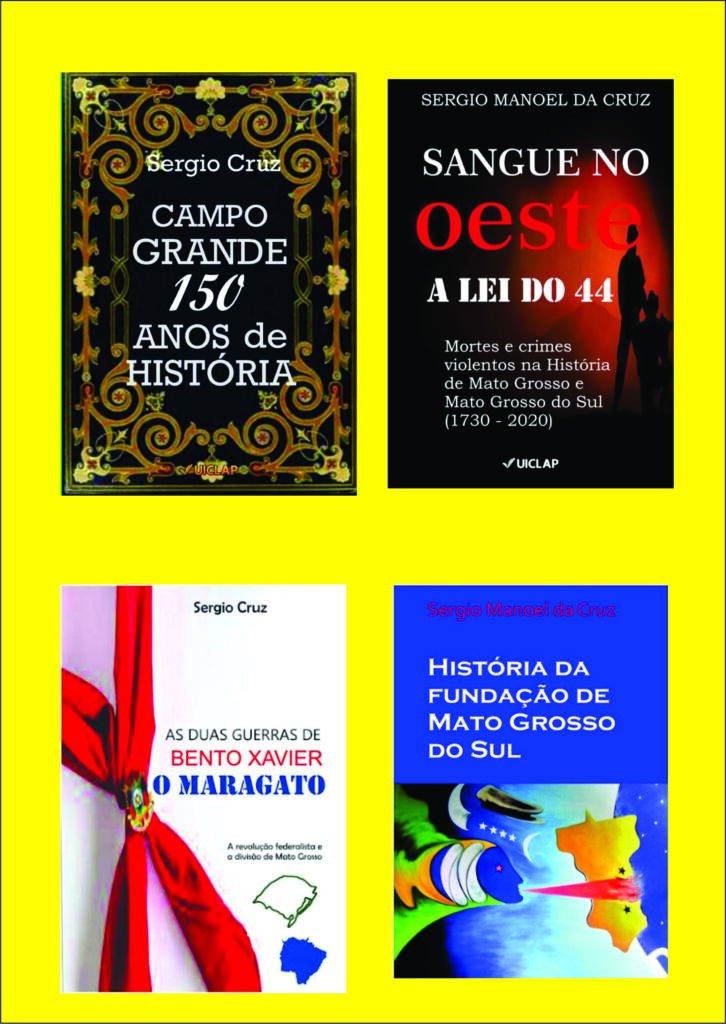 1 – O MARAGATO que descobriu Mato Grosso do Sul; 2 – CAMPO GRANDE 150 ANOS DE HISTÓRIA; 3 – A LEI DO 44 e os crimes que abalaram o Estado e 4 – HISTORIA DA FUNDAÇÃO DE MS, todos em uma só estante. Livros do jornalista Sergio Cruz, que traçam a linha do tempo da História do Estado. CLIQUE AQUI, escolha o seu ou compre a coleção completa.