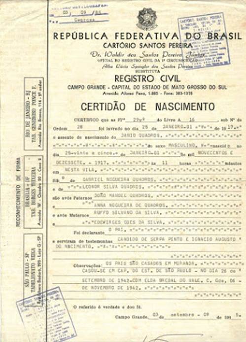 FOTO: Copia certificada do registro de nascimento de Jânio Quadros, fornecida pelo Cartório Santos Pereira (CG) (acervo de Luca Maribondo).