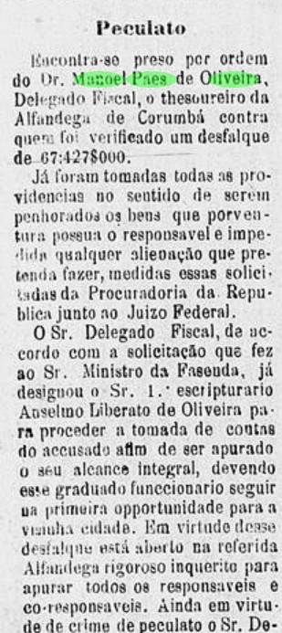 “Encontra-se preso por ordem do dr. Manoel Paes de Oliveira, Delegado Fiscal, o tesoureiro da alfândega de Corumbá contra quem foi verificado um desfalque de 67:427$000.