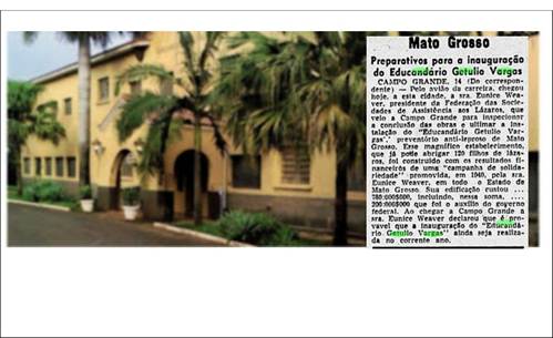 CAMPO GRANDE, 3 (Asapress) – Foi solenemente inaugurado o “Educandário Getúlio Vargas”, construído pela Sociedade de Assistência aos Lázaros e Defesa Contra a Lepra. Destina-se esse estabelecimento a recolher, manter e educar os filhos dos leprosos. Com uma capacidade de 200 leitos, nele serão abrigadas as crianças de até 18 anos. A sua construção foi iniciada em 1940, após uma campanha que rendeu 531.000,00 cruzeiros. A construção custou um milhão de cruzeiros, tendo o governo federal contribuído com o restante. Foram inaugurados os retratos do presidente da República, do ministro da Educação e do interventor Júlio Müller.