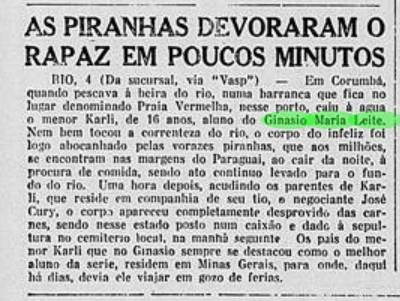 “Em Corumbá, quando pescava à beira do rio, numa barranca que fica no lugar denominado Praia Vermelha, nesse porto, caiu à água o menor Karli, de 16 anos, aluno do Ginásio Maria Leite. Nem bem tocou a correnteza do rio, o corpo do infeliz foi logo abocanhado pelas vorazes piranhas, que aos milhões se encontram nas margens do Paraguai, ao cair da noite, à procura de comida, sendo ato contínuo levado para o fundo do rio. Uma hora depois, acudindo os parentes de Karli, que reside em companhia de seu tio, o negociante José Cury, o corpo apareceu completamente desprovido das carnes, sendo nesse estado, posto num caixão e dado à sepultura no cemitério local, na manhã seguinte. Os pais do menor Karli, que no ginásio sempre se destacou como o melhor aluno da série, residem em Minas Gerais, para onde, daqui a dia dias, deviaele viajar em gozo de férias”. (JORNAL DE NOTÍCIAS, SP, 05/12/1945)