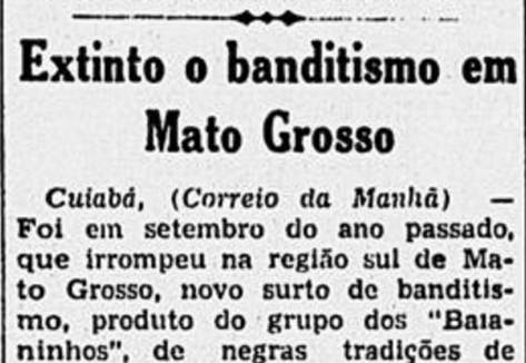 Sob o título “Extinto o banditismo em Mato Grosso”, o Correio da Manhã, do Rio de Janeiro, da conta a derrota do surto de violência na região Sul do Estado, avassalado pela ação dos grupos dos Baianinhos e outros bandidos: