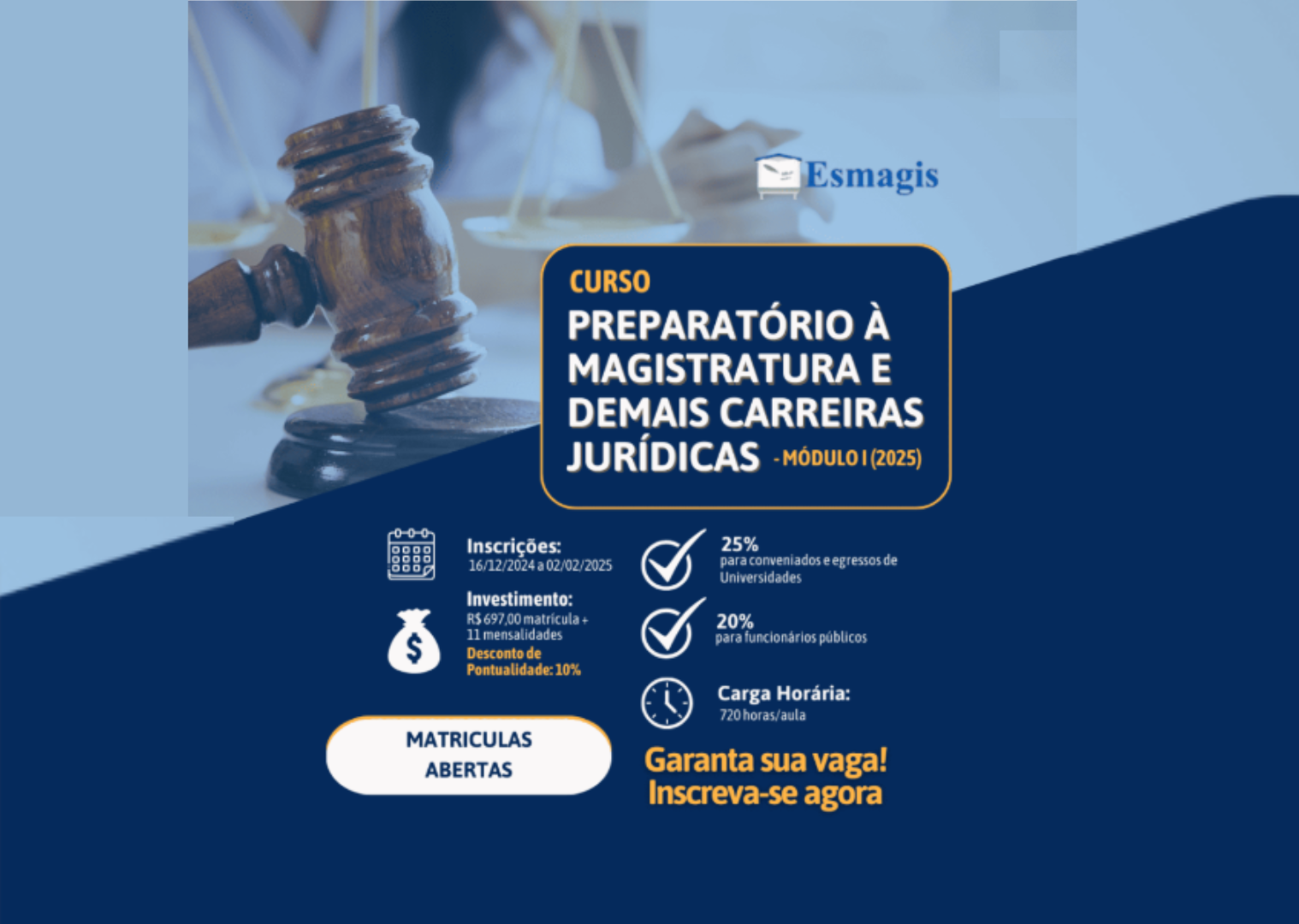 A Escola Superior da Magistratura de Mato Grosso do Sul (Esmagis) e a Associação dos Magistrados do Estado de MS (Amamsul) anunciaram a abertura das inscrições para o Curso Preparatório à Magistratura e Demais Carreiras Jurídicas – Turma 2025, com possibilidade de bolsa integral de estudo. As inscrições estarão abertas entre os dias 16 de dezembro de 2024 e 2 de fevereiro de 2025 e podem ser realizadas pelo site oficial da Esmagis. As aulas terão início no dia 3 de fevereiro do ano que vem.