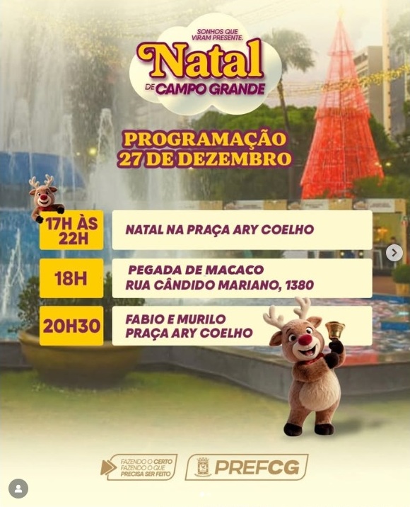 A programação do Natal dos Sonhos segue até o dia 31 de dezembro, mantendo a Praça Ary Coelho como ponto de encontro das famílias campo-grandenses. O público pode visitar a Casa do Papai Noel, o presépio, a árvore de Natal gigante, além da praça de alimentação. Diariamente, o espaço recebe apresentações de artistas regionais, valorizando a cultura local, e conta ainda com a presença dos personagens Rena e Ted, que seguem encantando as crianças e tornando a experiência ainda mais especial no coração da cidade.