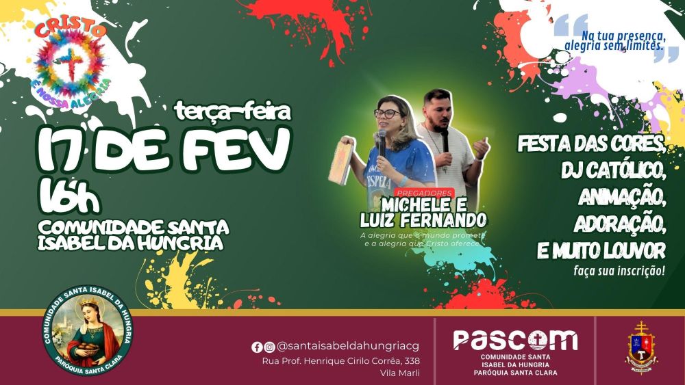Em meio ao ritmo intenso e às celebrações do Carnaval, uma proposta diferente surge como opção para os jovens que desejam viver uma alegria que vai além do momento passageiro. Nesta terça-feira, 17 de fevereiro, às 16h, a Comunidade Santa Isabel da Hungria promove o encontro “Cristo é a Nossa Alegria”, uma experiência que une música, animação, espiritualidade e convivência fraterna.