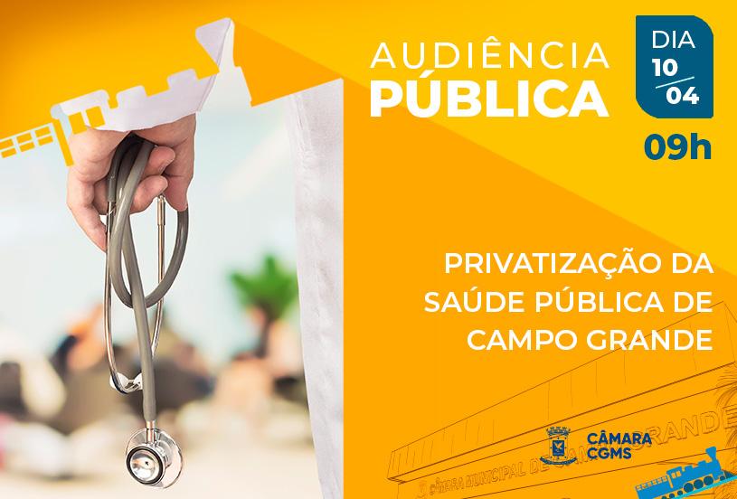 Privatização da Saúde Pública de Campo Grande será tema de Audiência Pública na Câmara Municipal, na sexta-feira, dia 10, às 9 horas. O debate foi proposto pela Comissão Permanente de Saúde da Casa de Leis, presidida pelo vereador Dr. Victor Rocha. Integram a Comissão ainda os vereadores Dr. Jamal, Veterinário Francisco, Neto Santos e Dr. Lívio.