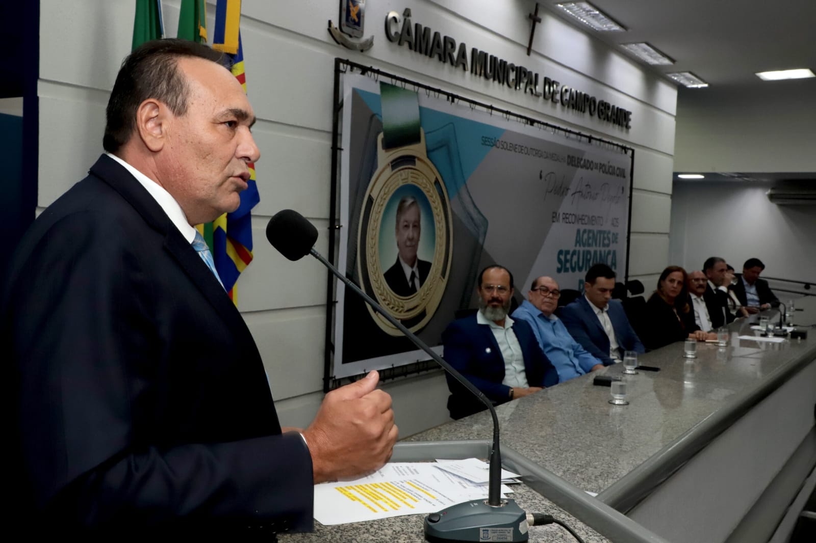 Por proposição do vereador Carlos Augusto Borges (Carlão PSB), presidente da Câmara Municipal de Campo Grande, foi realizada nesta segunda-feira (20), solenidade de outorga da “Medalha Delegado de Polícia Civil Pedro Antônio Pegolo”. Comenda oferecida a todos os agentes de segurança pública que, no desempenho das suas funções, tenham praticado atos de bravura e prestado relevantes serviços à cidade.