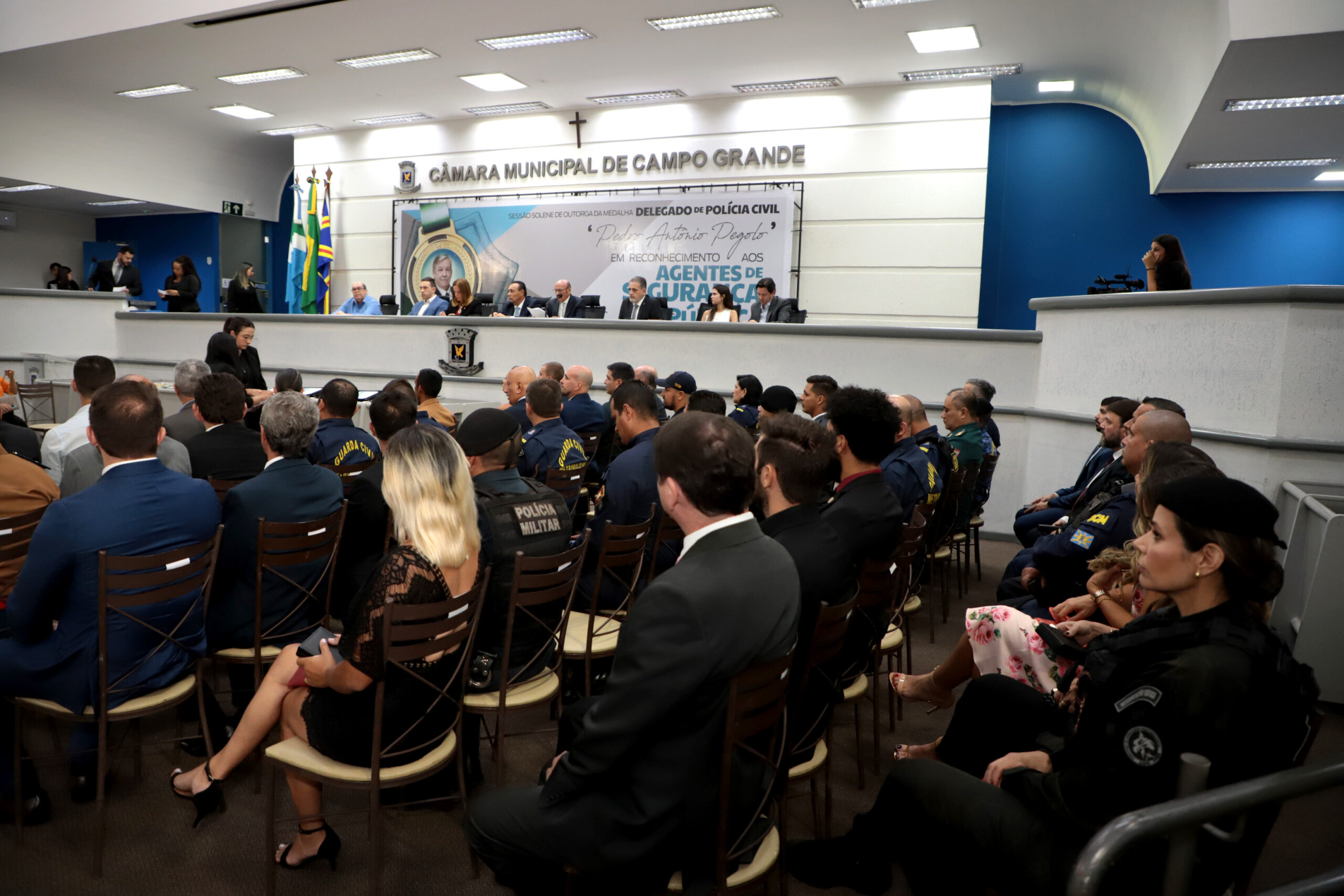 A solenidade ocorreu na noite desta segunda-feira, dia 20, em sessão especial na Casa de Leis presidida pelo vereador Carlos Augusto Borges (PSB) em que agentes de segurança pública que se destacaram em suas atividades foram homenageados com a comenda Delegado de Polícia Civil Pedro Antônio Pegolo. O vereador Marcos Tabosa (PDT) homenageou o Tenente Coronel Reinaldo Meitso Nakazato Junior e o GCM Patronides Acyr Franco.